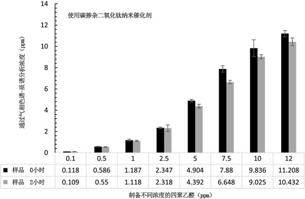 二氧化鈦摻雜的碳催化劑被認(rèn)為對(duì)水中的四聚乙醛降解無效,特別是與活性炭相比。圖3示出了前和2小時(shí)處理被碳摻雜二氧化鈦后在溶液聚乙醛的濃度2在UV-C光納米催化劑。在較高的初始濃度的金屬醛溶液如5、7.5、10和12ppm時(shí),與較低濃度的降解相比,降解稍微更顯著(2-9%)。