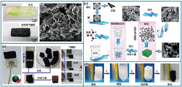 活性炭氣凝膠由納米結(jié)構(gòu)活性炭材料組成,其中孔隙充滿氣體。因?yàn)榭梢越Y(jié)合有益吸附性質(zhì)和高的熱穩(wěn)定性,并且擁有電子傳導(dǎo)性,和可成為催化劑載體,油或有機(jī)溶劑吸附和儲能方面的潛在應(yīng)用�;钚蕴繗饽z還有一個特征是它們的超輕質(zhì)。除了高度多孔和輕質(zhì)之外,另一個優(yōu)點(diǎn)是在轉(zhuǎn)化成活性炭氣凝膠后引入導(dǎo)電性的可能性,因此允許在電化學(xué)區(qū)域(例如,電池,超級電容器或?qū)щ姶呋瘎┹d體)中的應(yīng)用。隨著新型活性炭材料的發(fā)展,已經(jīng)生產(chǎn)出具有超低密度和優(yōu)異導(dǎo)電性的石墨烯或基于納米碳管的活性炭氣凝膠作為新興的新型氣凝膠材料,這進(jìn)一步拓展了氣凝膠材料的應(yīng)用領(lǐng)域。除了高級碳材料能制造氣凝膠外,使用生物質(zhì)做成的活性炭氣凝膠如圖7所示。