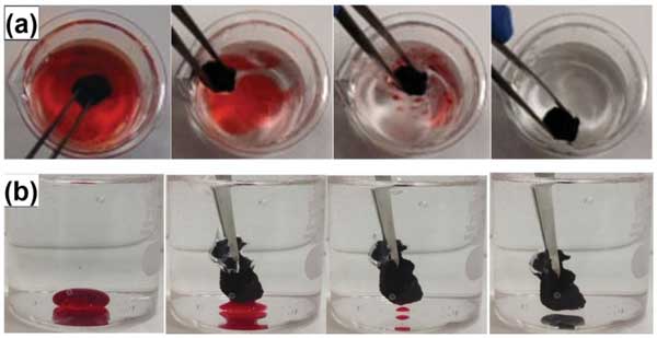 圖4:(a)通過使用間隔10秒的活性炭氣凝膠顯示庚烷吸附過程的照片。(b)照片顯示使用活性炭氣凝膠吸附氯仿的過程5秒內(nèi)完全被吸收。