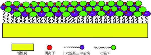 用表面活性劑改性的活性炭在電吸附過程中具有潛在的應(yīng)用,其中表面電荷和潤濕性起重要作用。用離子表面活性劑功能化的活性炭電極最近在電容去離子技術(shù),特別是反向電容去離子系統(tǒng)中引起了相當(dāng)大的關(guān)注。圖3表明在用吐溫80和HDTMA的二元混合物改性的活性炭上吸附陰離子。吐溫80的存在表明HDTMA的吸附密度增強(qiáng),完美填充(高穩(wěn)定性),這在電吸附過程中都是值得的。實(shí)際上,HDTMA的增強(qiáng)的吸附密度誘導(dǎo)了陰離子污染物的高吸附能力。此外,改進(jìn)的填料賦予表面活性劑在表面上的穩(wěn)定性。這些特殊效果是混合表面活性劑體系應(yīng)用的最終目標(biāo)之一,為了提高活性炭的表面活性,對于單一表面活性劑體系來說,這是不可能發(fā)生的。