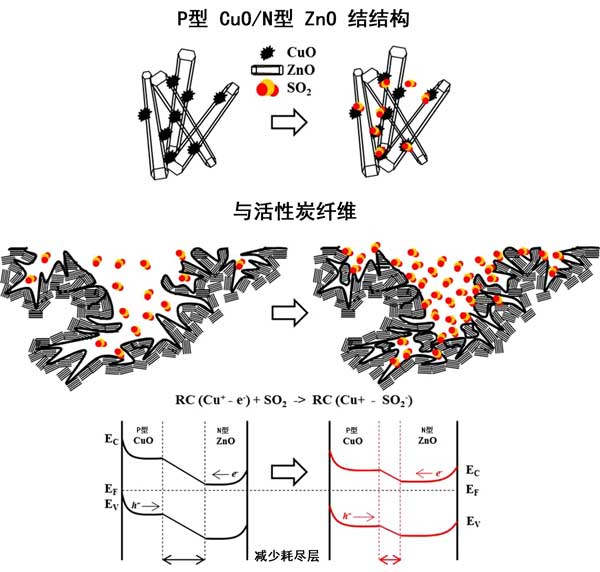 在圖3中,CuO顆粒隨機分散在ZnO花表面上。當CuO顆粒與ZnO花結(jié)合時,在p型CuO顆粒和n型ZnO花之間的界面處形成p/n結(jié)。在這種機制下,電子從n型ZnO轉(zhuǎn)移到p型CuO,并且空穴通過p型CuO到達n型ZnO,直到在系統(tǒng)中建立均勻的費米能級,從而導(dǎo)致能帶在耗盡層彎曲。然而,當CuO-ZnO組合結(jié)構(gòu)暴露于SO 2時,電子通過Cu +之間的氣敏反應(yīng)釋放和SO帶負電的2 -離子。還原的SO 2分子與CuO中的孔結(jié)合,從而減少了耗盡層和電阻。這種現(xiàn)象可通過降低電阻來實現(xiàn)良好的SO 2檢測。因此,p型CuO和n型ZnO的傳感響應(yīng)的貢獻代表了傳感器的主要特性,而活性炭纖維的比表面積在SO 2傳感特性中起著重要的作用。