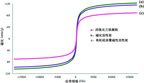 在這項(xiàng)研究中使用VSM來(lái)檢查合成活性炭的磁強(qiáng)度。對(duì)Fe 3 O 4顆粒,磁性活性炭和機(jī)硅涂覆磁性活性炭進(jìn)行了研究,以研究它們?cè)谕扛矔r(shí)的磁強(qiáng)度趨勢(shì)。幾種材料的磁滯回線分別示于圖1(a)-(c)。根據(jù)獲得的結(jié)果。由于存在非磁性活性炭和有機(jī)硅表面活性劑涂層,磁強(qiáng)度似乎下降了。這確認(rèn)涂覆過程成功。但是,盡管在涂覆最終材料機(jī)硅涂覆磁性活性炭時(shí)磁化強(qiáng)度降低,但其磁強(qiáng)度仍在可接受的范圍內(nèi),并且強(qiáng)度足以在吸附過程中進(jìn)行。