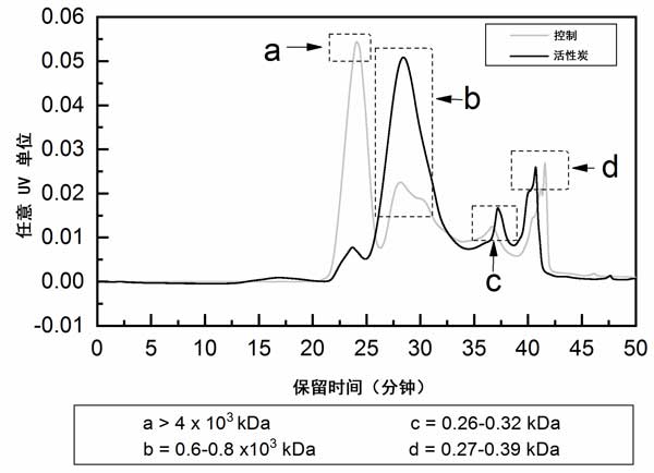 為了檢驗(yàn)活性炭改變可溶性微生物組成,使其對(duì)膜具有更高的親和力這一假設(shè),通過GPC分析了構(gòu)成可溶性微生物的有機(jī)分子的大小分布(圖1)。在第二次可溶性微生物運(yùn)行結(jié)束時(shí)收集了可溶性微生物樣品(圖1b),有趣的是,GPC色譜圖顯示了對(duì)照反應(yīng)堆和活性炭加入反應(yīng)堆之間的明顯差異。在活性炭反應(yīng)器的可溶性微生物中,保留時(shí)間為24分鐘時(shí),來自對(duì)照反應(yīng)器的可溶性微生物的第一個(gè)峰顯著降低,而在活性炭反應(yīng)器的可溶性微生物中,在28分鐘時(shí)觀察到峰的上升(圖1,分別是峰值a和b)�;钚蕴糠磻�(yīng)器的可溶性微生物中的37分鐘處的峰也升高(峰c)�?扇苄晕⑸镏心承┯袡C(jī)化合物含量的變化(升高或降低)可能歸因于,由于微生物群落組成的變化或某些活性炭所觀察到的代謝活性增強(qiáng),導(dǎo)致某些微生物產(chǎn)品的產(chǎn)生和分泌增加另外,或抑制進(jìn)水橄欖油廢水中物質(zhì)的降解。有機(jī)化合物對(duì)活性炭顆粒的吸附只會(huì)降低其在可溶性微生物中的外觀。由于吸附到活性炭上,可溶性微生物中某些成分的減少(如峰a所示)也有可能優(yōu)先吸附其他成分,這些成分對(duì)通量的減少更不利,或者起膜調(diào)節(jié)前體的作用,這可能會(huì)增強(qiáng)生物膜的生長(zhǎng)(例如峰b–d)。顯然,確定膜上有機(jī)污染物的身份是一項(xiàng)必不可少的任務(wù),目前,尚不清楚不同可溶性微生物組分對(duì)膜污染的詳細(xì)影響以及它們被活性炭的吸附。