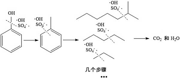 圖4顯示了苯酚的降解過程。首先破壞連接苯酚中羥基的化學(xué)鍵,然后打開苯環(huán)以形成通過單鍵連接的單鏈。隨著反應(yīng)的進行,單鏈之間的化學(xué)鍵被破壞,并形成具有較少碳原子數(shù)的單鏈。將鏈重組為新的長鏈的過程是由于氧化劑劑量不足。然而,隨著反應(yīng)的進行,諸如這些短鏈和新形成的長鏈的中間體被進一步降解。在此過程中,一些單鏈會隨著反應(yīng)時間的增加而重組形成一條更長的新單鏈。隨著這一過程的繼續(xù),長單鏈逐漸分解成短鏈,然后苯酚礦化成二氧化碳和水。