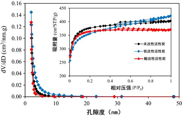 表面積和孔徑?jīng)Q定了吸附劑的吸附性能�;钚蕴烤哂写罅康膬�(nèi)部孔,具有較大的比表面積。HNO 3和Fe 對(duì)改性活性炭的BET表面積,BJH平均孔徑和孔體積均有不同程度的變化。在常溫條件下,濃HNO 3在活性炭表面溶解了一定的灰分,有助于進(jìn)一步擴(kuò)大多孔結(jié)構(gòu)。但是,濃HNO 3還腐蝕了活性炭的結(jié)構(gòu),從而部分破壞了內(nèi)部通道結(jié)構(gòu)并降低了活性炭的比表面積。至于鐵改性的活性炭,內(nèi)表面的鐵材料層堵塞了某些通道,從而降低了比表面積,平均孔徑和孔體積。