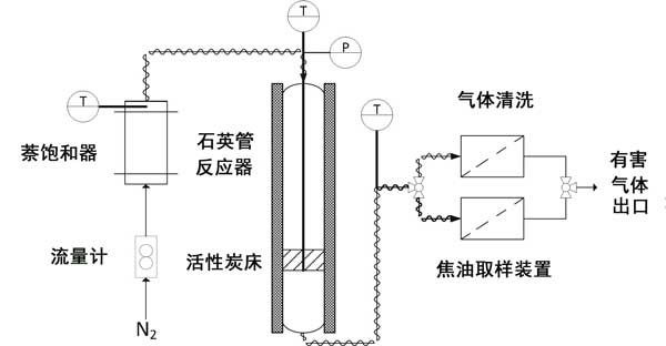 萘轉(zhuǎn)化試驗(yàn)已在圖1所示的實(shí)驗(yàn)設(shè)備中進(jìn)行,該設(shè)備顯示了其主要部分:進(jìn)料系統(tǒng),反應(yīng)器,采樣/清潔裝置和氣體分析儀。進(jìn)料系統(tǒng)由用于調(diào)節(jié)氮?dú)饬髁康霓D(zhuǎn)子流量計(jì)和萘飽和器組成,以獲取摻有焦油的物流。飽和器和反應(yīng)器之間的管道應(yīng)保持在150°C以上,以免萘發(fā)生冷凝。所使用的反應(yīng)器是內(nèi)徑為14 mm,總高度為600 mm的立式管狀石英反應(yīng)器。將活性炭床放在反應(yīng)器內(nèi)部的玻璃粉上方,該玻璃粉位于距頂部430毫米處。床的溫度通過K型熱電偶在床的中央進(jìn)行測定。在焦油采樣期間,通過切換三通閥,將反應(yīng)器出口處的氣體導(dǎo)入采樣裝置,并在其余時(shí)間內(nèi)導(dǎo)入清潔裝置。采樣裝置由三個(gè)撞擊器組成,在0°C時(shí)充滿異丙醇。專用實(shí)驗(yàn)表明,在本研究分析的條件下,該設(shè)備的捕獲效率超過99%。借助帶有熱導(dǎo)檢測器(TCD)的微型氣相色譜儀分析清潔區(qū)出口處的氣體,以在線測定短鏈烴(從乙炔到苯)和分子氫。實(shí)驗(yàn)裝置的更多詳細(xì)信息可以在其他地方找到。