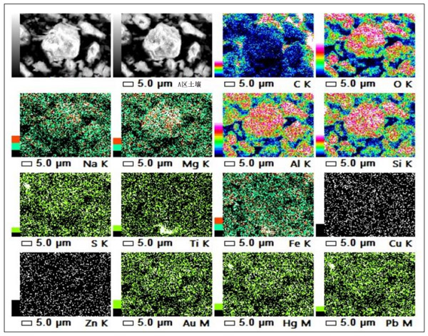 SEM-EDS測試使用了三個樣本,即A區(qū)域樣本,B區(qū)域樣本和原始土壤樣本。分析了這三個樣品。尋找的參數(shù)是充當污染物的重金屬元素。該測試的結果顯示了土壤中存在的元素的質量百分比。掃描電鏡是一種用于表面觀察的工具,其焦點深度大于光學顯微鏡,可以直接觀察復雜的表面而無需復制。SEM圖像顯示出樣品的形態(tài)狀態(tài),顯示出大小不規(guī)則的團塊。同時,EDS分析非常適合揭示樣品中的化學元素和化合物。EDS的元素映射將為對象表面上的每個元素賦予不同的顏色,并定量分析每個元素的百分比。