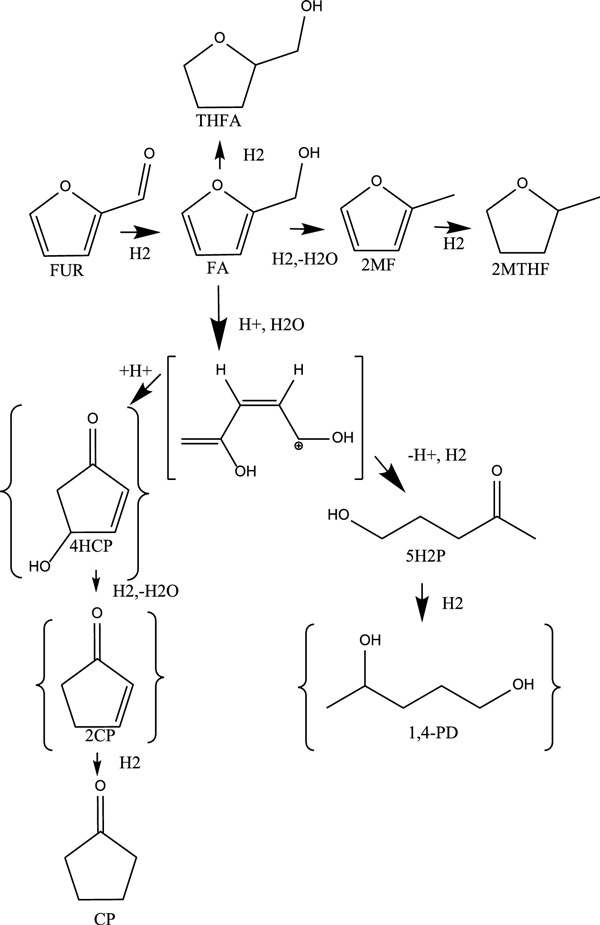在下一組實(shí)驗(yàn)中,確定了液體停留時(shí)間對(duì)糠醛加氫超過(guò)0.8%活性炭催化劑的影響(H 2氣流保持恒定在100 mL/min)�?啡┺D(zhuǎn)化率隨著液時(shí)空速的增加或停留時(shí)間的縮短而下降,碳封閉率在74%至100%之間。溫度,壓力和液體停留時(shí)間效應(yīng)研究的結(jié)果表明,活性炭催化劑主要通過(guò)糠醛促進(jìn)了糠醛中糠醇和2-甲基呋喃的形成,并通過(guò)推測(cè)性反應(yīng)途徑促進(jìn)了環(huán)戊酮和5-羥基-2-戊酮的少量形成,需要對(duì)酮進(jìn)行酸催化)形成(圖3)。