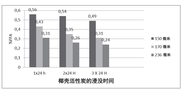 圖1:椰殼活性炭FFA數(shù)與粒徑和浸沒時(shí)間的關(guān)系。