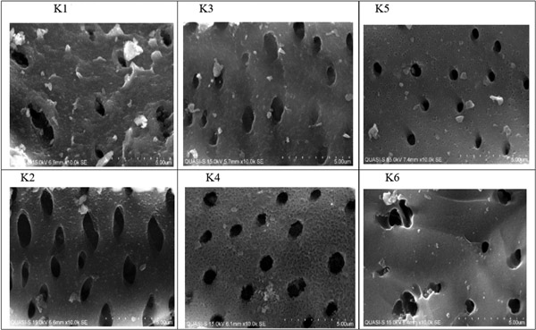 對原始活性炭(圖3中的K1)的掃描顯示出相當(dāng)均勻的孔�;钚蕴康慕Y(jié)構(gòu)可以看作是薄片,為不規(guī)則分布和各種尺寸的孔提供了較大的吸附面積。表面上的大多數(shù)可見孔都在5微米范圍內(nèi),這與對椰殼活性炭的預(yù)期一致,而在這5微米孔內(nèi)可以看到小于1微米的較小孔。圖3中的K2顯示了在氯酸鹽吸附到表面活性部位后活性炭表面的變化。這些孔有變化的跡象,因為其中一些吸附氯酸鹽,而其他孔被氯酸鹽和氯化物分子阻塞。在10,000倍的放大倍率下,可以觀察到小孔周圍和大孔入口處的沉積,因為預(yù)計表面活性基團(tuán)會大量存在于這些區(qū)域�;钚蕴康乃嵝栽偕鷺O有可能形成了表面活性部位,從而增強(qiáng)了活性炭吸附大量氯酸鹽的能力。