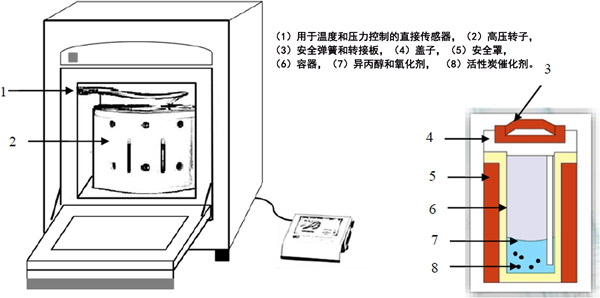 圖1是實(shí)驗(yàn)室設(shè)置的示意圖。微波消解實(shí)驗(yàn)站用于產(chǎn)生微波能量。在標(biāo)準(zhǔn)反應(yīng)運(yùn)行中,將10 mL異丙醇溶液轉(zhuǎn)移到100 mL鐵氟龍容器中。在攪拌下將所需體積的過氧化氫溶液(30%)注入到容器中。然后,將一定量的活性炭催化劑添加到該異丙醇溶液中,并在微波消解實(shí)驗(yàn)室站中照射120秒。在所有實(shí)驗(yàn)中,溶液溫度均保持在80±2°C,MW功率保持在600W。