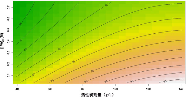 圖2:過氧化氫濃度和初始異丙醇濃度的相互作用效應(yīng)及其對(duì)總有機(jī)碳去除率的影響�;钚蕴康膭┝勘3趾愣ㄔ�90 g/L。