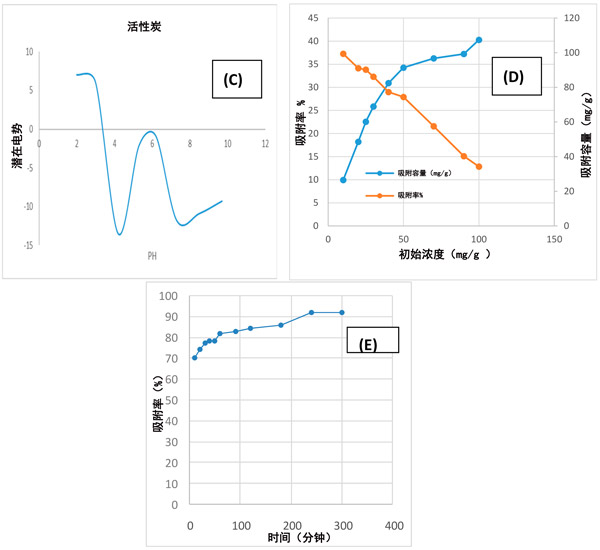 圖1:(A)吸附劑劑量的影響;(B)pH;(C)活性炭的電勢;(D)乙酰胺的初始濃度;(E)通過活性炭除去乙酰胺的接觸時間。