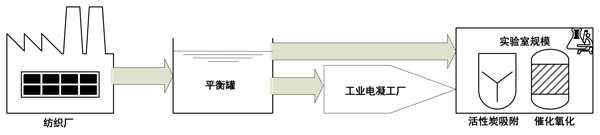 來自紡織廠的紡織廢水被存儲在均衡罐中,并轉(zhuǎn)移到工業(yè)規(guī)模的電凝處理廠。此后,如圖1所示,在實(shí)驗(yàn)室中進(jìn)行了催化臭氧氧化,然后進(jìn)行了吸附階段。單次吸附:在催化臭氧氧化之前,對于所有催化劑,吸附實(shí)驗(yàn)均進(jìn)行了30分鐘。將活性炭催化劑直接添加到廢水中。吸附在與臭氧化處理相同的反應(yīng)器中進(jìn)行,但沒有臭氧入口以維持均勻的實(shí)驗(yàn)條件。所有實(shí)驗(yàn)條件與臭氧化處理期間相同。溫度保持穩(wěn)定并且等于23±1℃。活性炭催化臭氧化:使用與吸附和臭氧化相同的反應(yīng)器進(jìn)行催化臭氧化。所有實(shí)驗(yàn)條件與臭氧化處理期間相同。對于所有催化劑,每次催化劑濃度為0.5g/L。反應(yīng)后,進(jìn)行催化劑的過濾(0.45μm過濾器)。