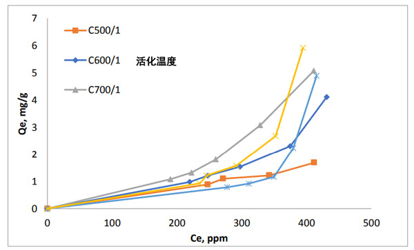 圖3顯示了鈣離子的吸附等溫線。等溫線表示分類的I型或II型。較低溶液濃度下的小肩部可能暗示了鈣離子微孔填充的單層吸附飽和。這表明孔表面與鈣離子之間的相互作用較強(qiáng)�;钚蕴康牡涂紫抖热员硎綢II型等溫線,因?yàn)闆]有明顯的微孔可以被鈣離子填充,而不是外表面和大孔。