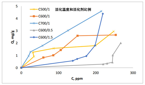 從圖2中可以看出,活性炭在不同的活化溫度(500℃,600℃和700℃)和活化劑比率(0.5、1.0和1.5)下的鋰吸附等溫線。似乎在較低濃度下吸附能力相對較低。這表明鋰離子對活性炭表面的親和力低。高濃度下容量的增加與孔隙率成正相關(guān)�;钚蕴康妮^大表面積傾向于更多地吸附鋰離子。在等溫線的分類中,該等溫線被認(rèn)為是III型等溫線,對于無孔或大孔吸附劑來說是典型的。因此,鋰離子似乎不附著在微孔內(nèi)部,而是附著在外部和大孔表面�;钚蕴繉︿囯x子的親和力低。炭表面的碳原子與溶液中的鋰離子之間的低相互作用可能是由于離子的原子質(zhì)量低所致。原子間勢相互作用表明該力與相互作用原子的原子質(zhì)量以及原子之間的距離具有正相關(guān)。