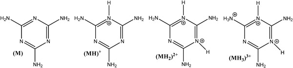 優(yōu)化了活性炭的用量和三聚氰胺溶液濃度范圍的影響,以實(shí)現(xiàn)定量分析吸附前后,以及這些研究中使用的所有活性炭中三聚氰胺的最佳條件。最初的實(shí)驗(yàn)涉及不同的吸附劑劑量,以及用于吸附物檢測和定量的多種方法。通過考慮三聚氰胺在水中的溶解度(酸性和堿性條件)以及吸附實(shí)驗(yàn)前后溶液中的可測量水平來選擇三聚氰胺溶液的濃度范圍。由于三聚氰胺(M)是堿,因此它可以在水溶液中經(jīng)歷幾次酸/堿平衡反應(yīng)并形成不同的質(zhì)子化物質(zhì)(見圖1)。
