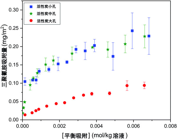 圖2:三聚氰胺在30°C下在三種活性炭的吸附等溫線,通過活性炭表面積標(biāo)準(zhǔn)化。