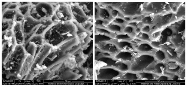 通常,由碳化過程形成的活性炭具有粗糙的表面結(jié)構(gòu),其孔徑不會太大以至于會影響吸附能力(圖1)。粒度和表面積對吸附劑很重要,因為粒度會影響吸附能力。由該圖可知,通過RSS碳化處理得到的活性炭的孔徑為40μm左右,未改性,使用活化液進(jìn)行改性后,為<20μm。這表明,活化液的浸漬在孔的形成中起著重要的作用。促進(jìn)更多的孔隙形成�?偙砻娣e影響總吸附容量,從而提高吸附劑去除廢水中有機(jī)化合物的效率。