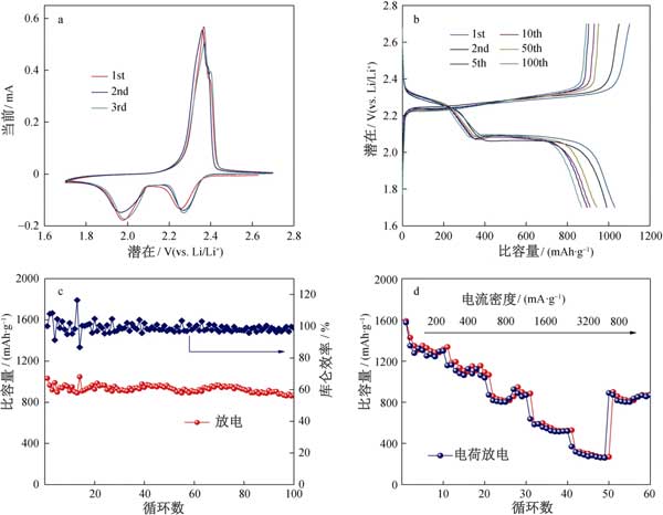 為了評(píng)估活性炭作為陰極的電化學(xué)性能,將鋰箔作為陽(yáng)極組裝到鋰硫電池的紐扣電池中。用于第一,第二和第三個(gè)循環(huán)的循環(huán)伏安圖(CV)曲線上在0.05毫伏·秒的掃描速率的電位窗口進(jìn)行(圖2A)。在第一循環(huán)期間,觀察到兩個(gè)陰極峰在2.26和1.97 V,CV曲線中最初的幾個(gè)循環(huán)幾乎重疊,這表明循環(huán)穩(wěn)定性極佳,容量保持率相對(duì)較高�;钚蕴康暮汶娏鞒潆�/放電曲線和循環(huán)穩(wěn)定性的測(cè)試中,如在圖中所描述2B、C。活性炭電極的首次放電容量為1045 mAh·g -1,約為硫理論容量的62.5%。此外,活性炭電極在第100次循環(huán)時(shí)也顯示出869.8mAh·g -1的放電容量。如圖2d所示測(cè)量活性炭的倍率性能,在200–3200 mA·g -1下表現(xiàn)出1260、1050、806、513、290 mAh·g -1的可逆放電容量。此外,當(dāng)電流密度達(dá)到800 mA·g時(shí),活性炭陰極的放電容量為802 mAh·g -1。多孔活性炭材料表現(xiàn)出中等的鋰硫電池電化學(xué)性能,顯示出高性能鋰硫電池的潛力。