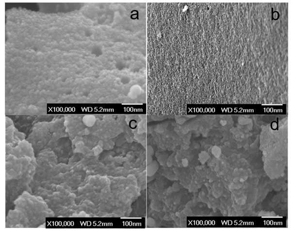 首先是電子顯微鏡,圖1顯示了活性炭(a),高溫活化后的活性炭(b),鎢浸漬活性炭(c)和鎢浸漬活性炭載鉑催化劑(d)的形態(tài)。SEM圖像(圖1a)顯示了在CO 2氣氛下在800℃下氣化的固體炭的形態(tài)。其多孔表面是由高溫下的CO 2蝕刻過程所貢獻的。高溫活化后的活性炭變得高度多孔,在1000°C碳化后,炭中形成了更多的孔和通道(圖2b)。鎢浸漬活性炭樣品中原始的活性炭結構似乎消失了(圖1c),因為在高溫下活性炭和氧化鎢之間的碳熱還原反應破壞了活性炭結構。活性炭的壁表面嵌入了直徑在3到10 nm之間的納米粒子(圖1c),根據XRD結果,這意味著這些納米粒子應為碳化鎢結構。在鎢浸漬活性炭樣品中加入1.0%鉑后,表面形態(tài)無明顯變化(圖1d)。