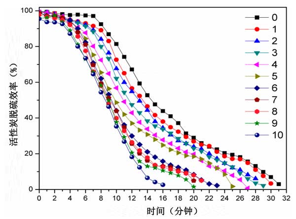圖3:再生活性炭的脫硫效率,其中0-10代表循環(huán)數(shù)。