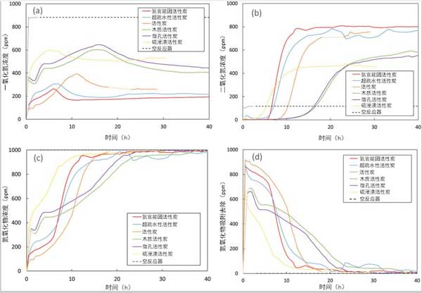 為了測試活性炭在環(huán)境溫度下對氧化和去除的催化和吸附性能。這些簡化的條件與實(shí)際煙氣條件大不相同,后者具有不同的成分和雜質(zhì),并且在不同的壓力和溫度下。但是,這些條件使我們能夠簡化復(fù)雜的系統(tǒng),以更好地了解NO氧化。圖中顯示了在干燥條件下,環(huán)境溫度和壓力下不同活性炭在NO氧化過程中NO,NO 2和氮氧化物的濃度分布圖。NO氧化轉(zhuǎn)化率與運(yùn)行時間的關(guān)系也可以由NO濃度來計(jì)算的。還計(jì)算了每個給定時間的NO入口和氮氧化物出口濃度之間的差異,并顯示為通過吸附去除的氮氧化物量。基線測試代表在相同條件下通過使用無活性炭催化劑的空反應(yīng)器進(jìn)行的測試。穩(wěn)態(tài)NO轉(zhuǎn)化率,氮氧化物的累積量吸附,以及所需要的時間,以達(dá)到最大的NO濃度或吸附的突然釋放NO 2的出口流中還從濃度曲線中獲得了這些元素。