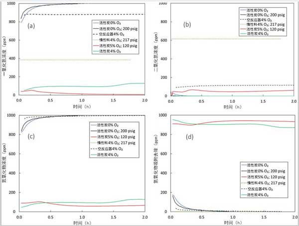 在大氣或高壓下沒有氧氣的情況下進(jìn)行的基線活性炭測試中吸附的NO,NO 2,氮氧化物和氮氧化物的濃度曲線證實(shí),即使在200 psig的高壓下也不會發(fā)生NO 2的形成或大量NO的吸附。在沒有氧氣的情況下,活性炭催化劑上沒有NO吸附。即使在200 psig下,NO也無法物理吸附在活性炭表面上,而且氧氣的存在也是必不可少的以促進(jìn)NO在化學(xué)吸附的氧位點(diǎn)上的化學(xué)吸附。