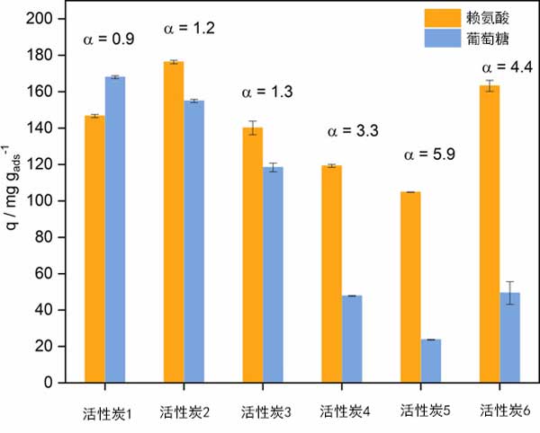 在單組分吸附中,極性最低的賴氨酸(在pH10時)的解離狀態(tài)適合在疏水性活性炭上的吸附。出人意料的是,競爭性吸附表明,親水性更高的活性炭(由較高的氧表面基團含量引起)導致對賴氨酸吸附的選擇性更高。我們建議,葡萄糖(在pH10時不帶電)吸附主要依賴于基于較弱范德華力和疏水相互作用的物理吸附。由于葡萄糖和賴氨酸的極性相似,因此無法針對低功能化碳進行基于物理吸附的分離。相反,氧官能團含量的增加使得賴氨酸的胺基團與活性炭的氧表面基團之間的靜電相互作用和氫鍵增強,從而與葡萄糖相比對賴氨酸具有更高的選擇性。為了進一步了解賴氨酸-葡萄糖吸附對賴氨酸的高選擇性的起源并增強吸附性能,對活性炭進行了系統(tǒng)地改性,以適應表面化學性質。