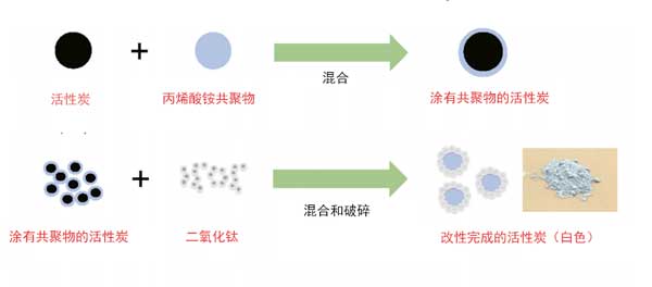 活性炭通常用作出色的多功能吸附劑。活性炭的多孔表面可通過(guò)將極薄的化合物層粘附到較大的碳表面積上來(lái)使各種化學(xué)物質(zhì)失活。它們通常用于吸附去除飲用水和工業(yè)用水中的顏色,氣味,味道和不良有機(jī)和無(wú)機(jī)污染物。此外,活性炭常用于許多化學(xué),食品和其他物質(zhì)的純化。因此,基于我們的發(fā)現(xiàn),活性炭對(duì)各種產(chǎn)生體味的化合物表現(xiàn)出高吸附能力,改性后更強(qiáng)。將平均直徑為9.4或40.5μm的活性炭粉與丙烯酸銨共聚物溶液在超純水中完全混合。將平均直徑為0.25μm的二氧化鈦粉末以5-20g的不同濃度添加到混合物中,以制造相應(yīng)的改性活性炭。在115℃下將樣品干燥2小時(shí)后,使用破碎機(jī)通過(guò)均勻研磨獲得除異味活性炭(圖1)。并且比較了活性炭與除異味活性炭中所含活性炭的吸附能力。