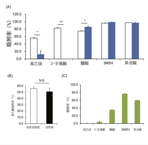 我們測(cè)試了活性炭對(duì)五種散發(fā)惡臭的揮發(fā)性有機(jī)化合物的吸附能力。發(fā)現(xiàn)活性炭對(duì)二乙�;�2-壬烯醛的吸附水平均高于氧化鋅。但是,與醋酸氧化鋅相比,活性炭的吸附效果略低(圖3A)。相反,活性炭和氧化鋅對(duì)3M2H和異戊酸的吸附能力之間沒(méi)有顯著差異。為了比較活性炭和改性活性炭中所含活性炭的吸附能力,使用無(wú)法吸附在二氧化鈦上的二乙酰基測(cè)試了相同量活性炭中的吸附水平。發(fā)現(xiàn)與活性炭相比,改性活性炭的吸附能力沒(méi)有顯著變化(圖3B)。