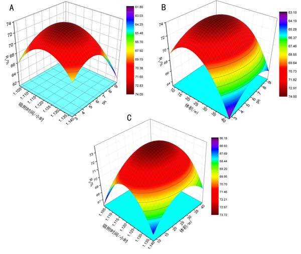 圖3:(A)吸附時間和pH在反應表面上的相互作用。(B)pH和溶液在響應表面上的相互作用。(C)吸附時間和溶液在反應表面上的相互作用。