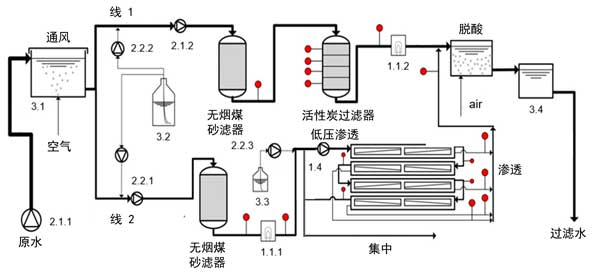 半技術(shù)試驗(yàn)工廠安裝了電氣安裝,工廠控制和數(shù)據(jù)管理。中試工廠由兩條處理線活性炭和反滲透膜(參見圖1)組成,具有17個采樣點(diǎn)。充氣后的原水通過增壓泵2.1.1和2.1.2從儲水箱(3.1)連續(xù)泵出。將痕量有機(jī)污染物(3.2)注入標(biāo)有2.2.1和2.2.2的泵的吸入側(cè),以確保適當(dāng)?shù)臎_洗混合和良好的分散性。加水后的水以平行模式通過無煙煤砂濾池以及隨后的活性炭(線1)和反滲透膜(線2)。每月對粒子過濾器進(jìn)行反沖洗。為了測試紫外線消毒在反滲透膜之前作為減少生物結(jié)垢的附加預(yù)處理步驟的效果,在活性炭砂濾池的下游操作了紫外線裝置(1.1.1)。反滲透膜管線的進(jìn)料通過兩個濾筒過濾器進(jìn)行預(yù)處理,兩個濾筒過濾器依次安裝了80和5μm的標(biāo)稱截止值。