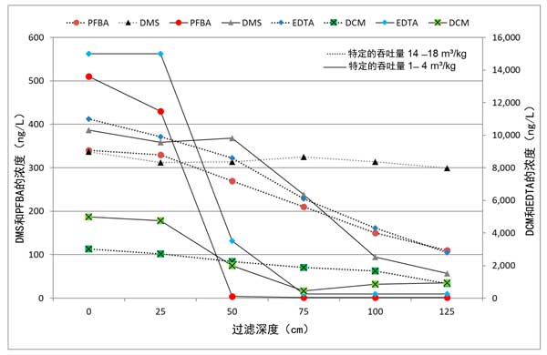 圖2:活性炭過濾器中痕量有機(jī)污染物的深度依賴濃度曲線。