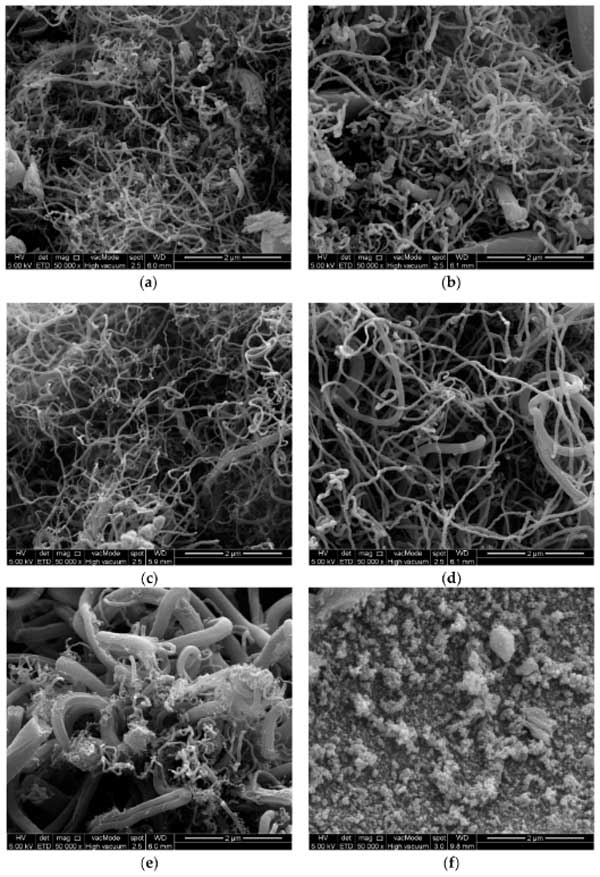 用FESEM技術(shù)分析了合成樣品的形態(tài)特征。圖2a-f顯示了放大的50,000倍的六個選定活性炭樣品圖像。圖2c顯示了活性炭5的FESM圖像,通過使用5%的鐵作為單催化劑和40分鐘的反應(yīng)時(shí)間,發(fā)現(xiàn)炭產(chǎn)率和接觸角較高。在此樣本中發(fā)現(xiàn)了兩種類型的碳納米材料,分別是碳納米纖維和多壁碳納米管。圖2f顯示了活性炭3的FESEM圖像,該圖像是通過使用4%的鈷作為單催化劑和40分鐘的反應(yīng)時(shí)間制備的。發(fā)現(xiàn)僅使用大量的鈷作為催化劑產(chǎn)生非常差的炭產(chǎn)率,這表明材料制備得不怎么好。圖2e顯示了活性炭4的FESEM圖像,該圖像是通過使用5%的鐵和4%的鈷作為雙金屬催化劑制備的,反應(yīng)時(shí)間為40分鐘。該圖像表明,使用大量的鈷和鐵時(shí),主要生成聚集的炭納米材料和碳納米纖維,因?yàn)檫@樣的實(shí)驗(yàn)條件不是優(yōu)選的。