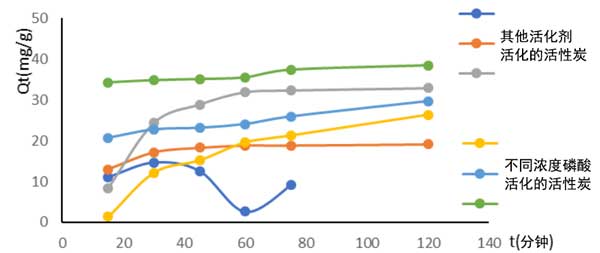 活性炭的吸附時(shí)間影響可從圖1看出,活性炭吸附分三步進(jìn)行:第一是在最初的30分鐘內(nèi),污染物的吸附量很快就被確定了,這可以用在吸附劑的外表面存在大量空置的結(jié)合位點(diǎn),這使得吸附劑易于吸附到該表面。第二在31分鐘后,吸附速率降低,過(guò)程緩慢�;钚蕴康钠渌恢眠_(dá)到飽和后,污染物顆粒將遷移到吸附劑內(nèi)部。由于易于接近,因此吸附過(guò)程緩慢:顆粒內(nèi)擴(kuò)散。第三從80分鐘開(kāi)始,我們觀察到一次接觸,活性炭已達(dá)到其最大容量。我們可以說(shuō)這些吸附劑的平衡時(shí)間是80分鐘。然而,磷酸活化的活性炭吸附量的演化曲線(xiàn)顯示,在最初的30分鐘內(nèi),污染物的吸附量顯著增加,此后,污染物的吸附量急劇下降,這將是一種產(chǎn)物解吸。這一現(xiàn)象在其他吸附劑中是不可見(jiàn)的,這可能意味著可用孔隙的數(shù)量和結(jié)合力隨著所用活化劑濃度的增加而增加,這一點(diǎn)還通過(guò)碘值和亞甲基藍(lán)的值進(jìn)行了驗(yàn)證。