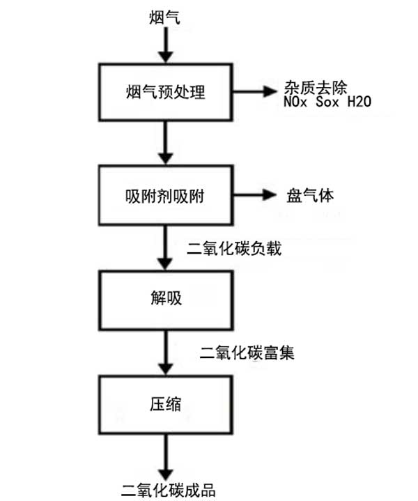 二氧化碳的吸附技術(shù)的簡(jiǎn)化圖在圖二顯示。首先將煙氣中的水分,硫和氮氧化物凈化。然后,所制備的氣體進(jìn)入使用固態(tài)吸附劑的吸附階段,例如活性炭,沸石,金屬有機(jī)骨架,多孔聚合物,基于堿金屬和胺的碳酸鹽的固體材料,碳球等。之后,吸附劑進(jìn)入解吸階段,在此階段釋放出富含CO2的氣體混合物,然后在壓力下將其壓縮。該技術(shù)的優(yōu)點(diǎn)是二氧化碳萃取效率高,再生成本低以及吸附劑操作的穩(wěn)定性。活性炭對(duì)CO2和N2的吸附能力很高,具有不同于沸石的大比表面積,并且還可以在潮濕條件下工作。而且,活性炭比沸石具有更低的吸附熱,因此它們可以更容易地再生。因此,在25°C和1bar的溫度下,活性炭的吸附熱為3kJ,而沸石為30kJ。收集二氧化碳的吸附劑質(zhì)量的重要指標(biāo)之一是二氧化碳的吸附量。基本上,在靜態(tài)條件下和動(dòng)態(tài)條件下都進(jìn)行吸附容量的研究。