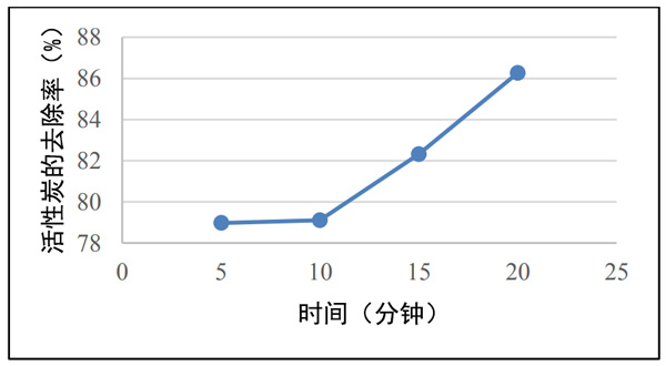 吸附時(shí)間測試:將豆腐廢液行業(yè)樣品溶液制備到四個(gè)燒杯中。在每杯中加入多達(dá)0.5克的椰殼活性炭。攪拌下靜置5分鐘,10分鐘,15分鐘,20分鐘。之后,用移液管吸取10mL溶液,然后將其放入試管中。加入0.4mL苯酚溶液,0.4mL硝普鈉,1mL氧化溶液。放置1小時(shí)以產(chǎn)生顏色。形成顏色后,使用濾紙將活性炭與樣品溶液分離。倒入比色杯,使用分光光度計(jì)對其進(jìn)行分析,讀取并記錄其在640nm波長處的吸收。時(shí)間變化的吸附用K2CO3活性炭和HCl活性炭進(jìn)行兩次。