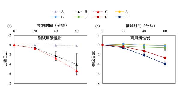 圖2:在不同的接觸時(shí)間(0、20、40和60分鐘),測(cè)試用(a)和活性炭(b)去除MS2。