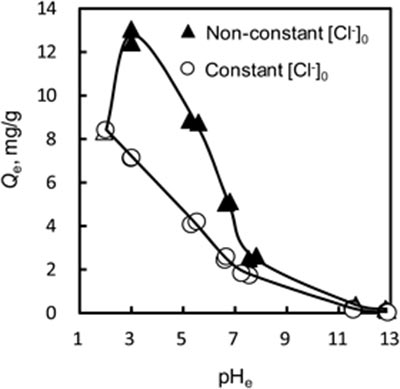 活性炭上的硝酸根離子吸附量與溶液的pH e之間的關(guān)系如圖1所示。硝酸根離子在堿性條件下幾乎不被吸附,這意味著氫氧根離子會抑制硝酸根離子的吸附。另一方面,隨著平衡pH的降低,硝酸根離子的吸附量增加。在堿性條件下,由于硝酸根離子與活性炭表面之間的靜電排斥,硝酸根離子很難被吸附在活性炭上。另一方面,硝酸根離子的吸附量在酸性條件下增加,這歸因于硝酸根離子與碳表面之間的靜電吸引力。然而,隨著平衡pH從3.0降低到2.0,觀察到硝酸根離子吸附的顯著降低。在此pH范圍內(nèi),氯離子的初始濃度從2 m增加到20 m M,這意味著共存的氯離子會抑制硝酸根離子的吸附。通過NaCl溶液將氯離子的初始濃度固定在20 m M時,可以清楚地發(fā)現(xiàn)氯離子對硝酸根離子的吸附抑制作用,表明硝酸根離子在所有pH區(qū)域的吸附量均低于沒有任何pH調(diào)節(jié)的溶液。因此共存陰離子會導致競爭吸附影響硝酸根離子吸附的效果,并且這種作用可能是較強的在共存陰離子的濃度較高。