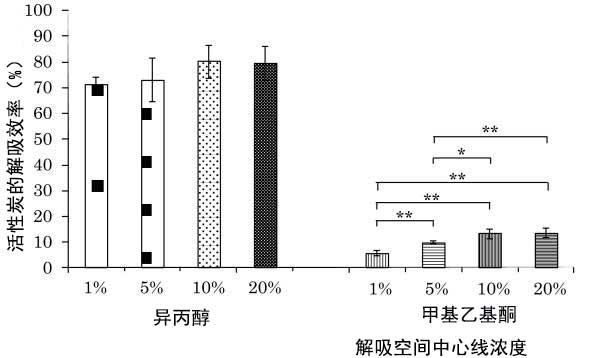 如示于圖2所示,異丙醇的解吸效率不會(huì)受表面活性劑濃度。然而,在甲基乙基酮中,當(dāng)表面活性劑濃度增加至10%時(shí),解吸效率增加。表面活性劑的去污力和增溶能力都有助于有機(jī)溶劑從活性炭中解吸附。