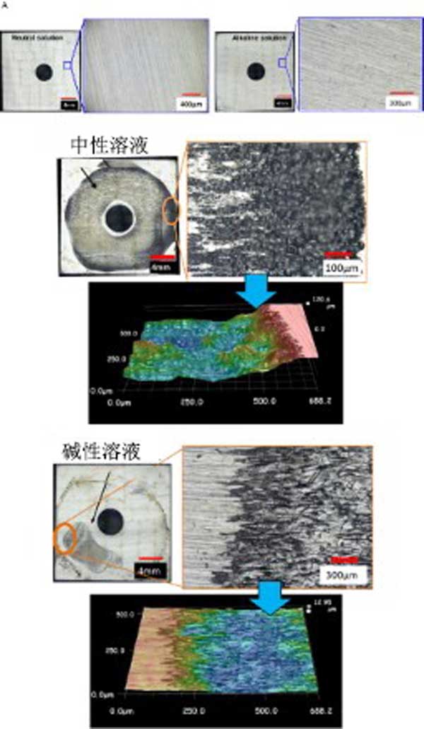 使用光學顯微鏡觀察實驗后樣品的表面形態(tài),如圖3所示。在中性和堿性溶液中未與活性炭接觸的樣品中未觀察到縫隙腐蝕。另一方面,在中性和堿性測試溶液中與活性炭接觸的樣品上發(fā)生縫隙腐蝕。這些結果清楚地表明,當樣品與活性炭接觸時,縫隙腐蝕敏感性增加。在中性測試溶液的情況下,最大腐蝕深度為130μm并且縫隙腐蝕傳播以覆蓋樣品的幾乎所有褶皺區(qū)域。在堿性測試溶液的情況下,最大腐蝕深度為25μm并且腐蝕區(qū)域遠小于中性溶液的情況。這些結果表明,在中性溶液的情況下腐蝕區(qū)域和深度更大,這表明在吸附塔中發(fā)生實際腐蝕。在堿性溶液的情況下腐蝕面積和深度較小的原因被認為是Fe(OH)2的溶解速率的事實堿性溶液減少,這導致腐蝕速率降低�;旧希陉枠O部位的pH降低至去鈍化pH是縫隙腐蝕開始和傳播所必需的�?紤]到這個方面,還可以解釋縫隙腐蝕行為的差異。