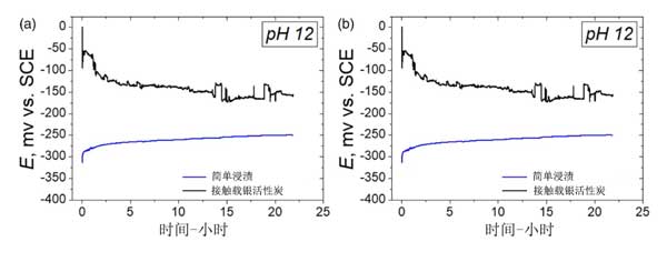 中性和堿性溶液中試樣的開路電位隨時間的變化如圖4所示。與銀浸漬活性炭接觸的樣品的開路電位在最初階段是高的,然后在中性和堿性溶液的實驗開始時急劇下降。根據這些結果,認為在實驗開始時發(fā)生縫隙腐蝕,當樣品與銀浸漬活性炭接觸時開路電位降低。結果表明“電化學效應”是嚴重縫隙腐蝕的主要原因。